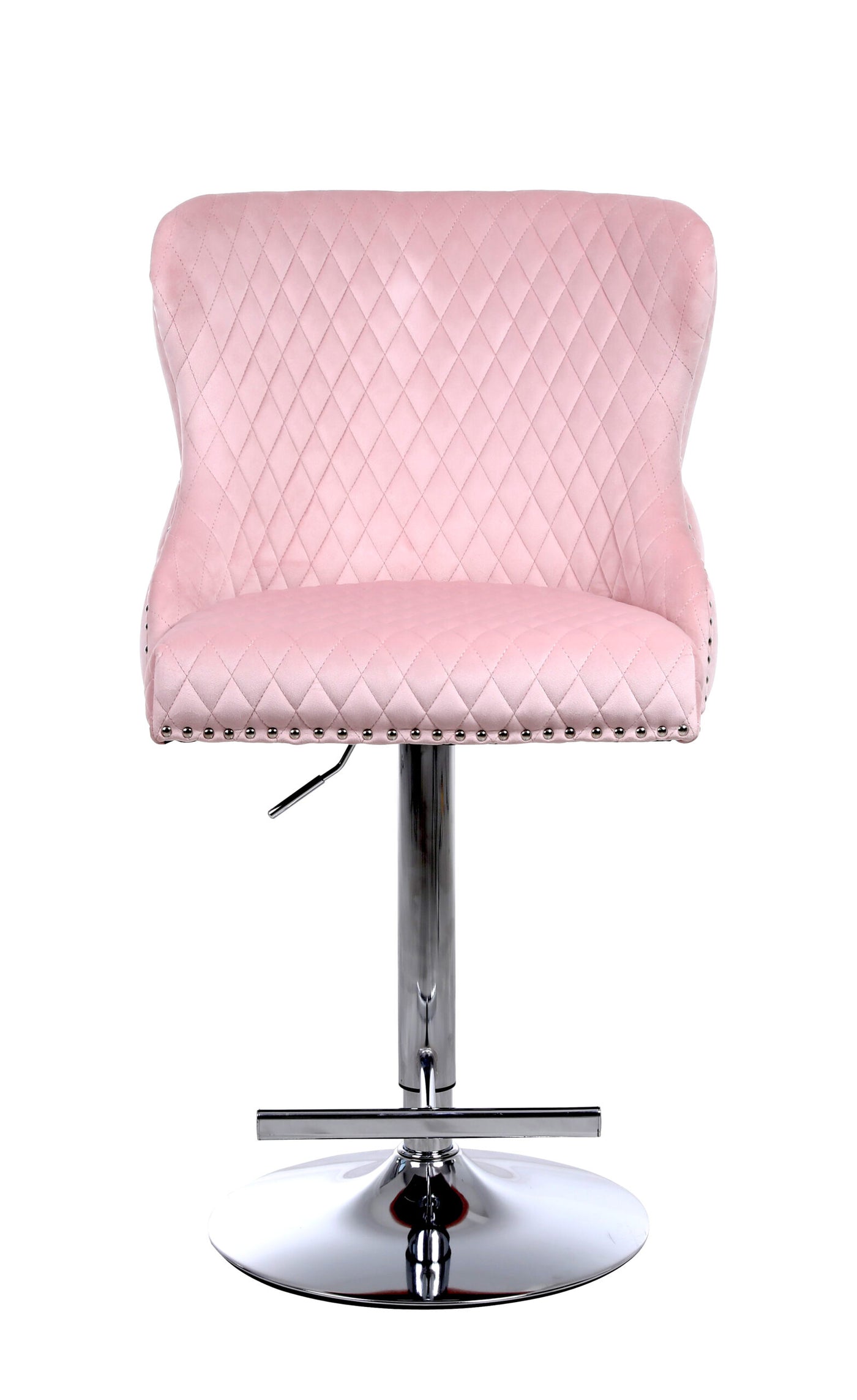 Add a touch of playful sophistication to your space with this stunning bar stool. Crafted with plush pink velvet, it's designed to bring both comfort and fabulous flair to your kitchen island or home bar. The adjustable height feature ensures a perfect fit for any counter, while the sturdy base provides reliable support. Elevate your decor with this chic and comfortable seating option.