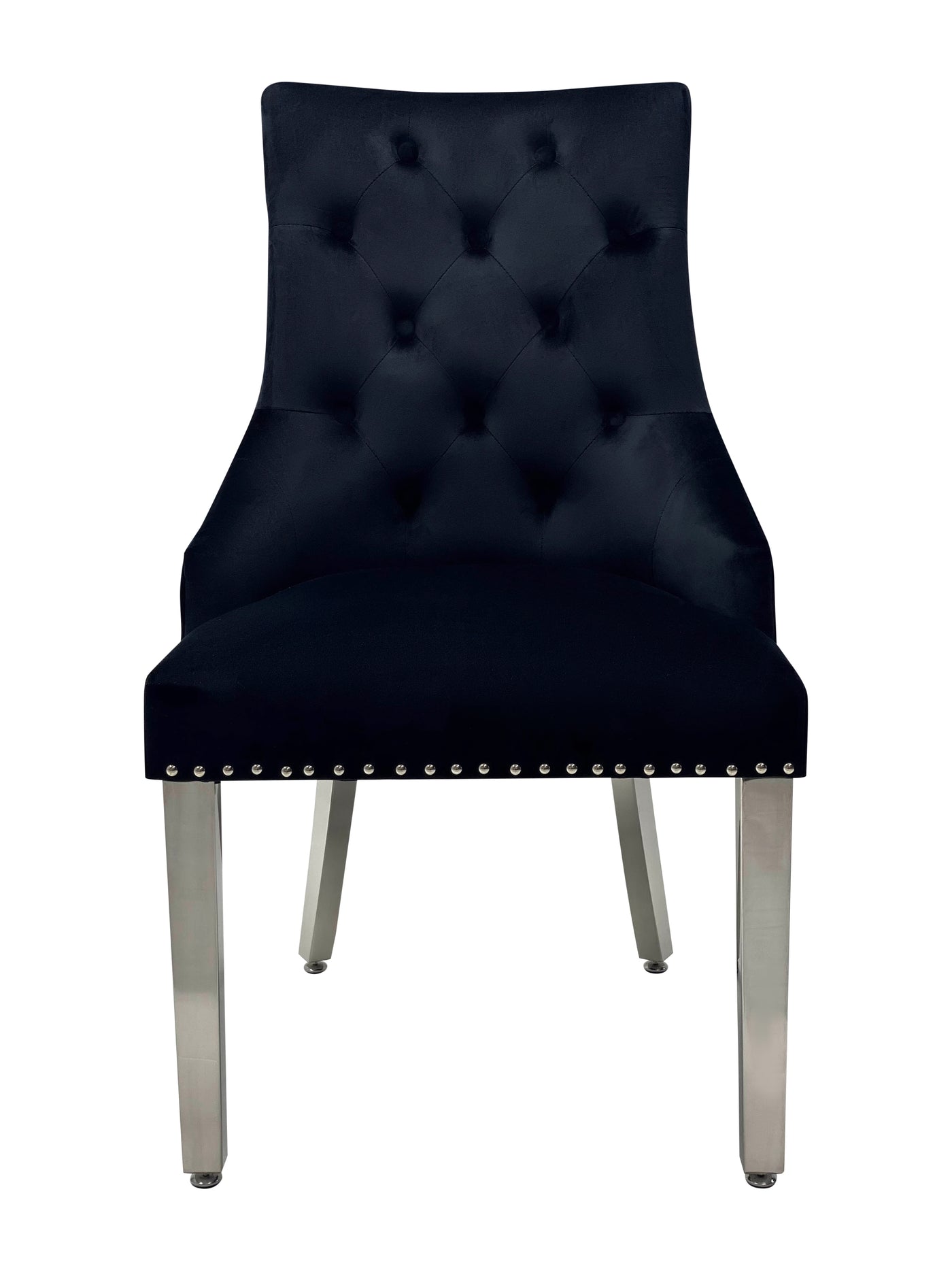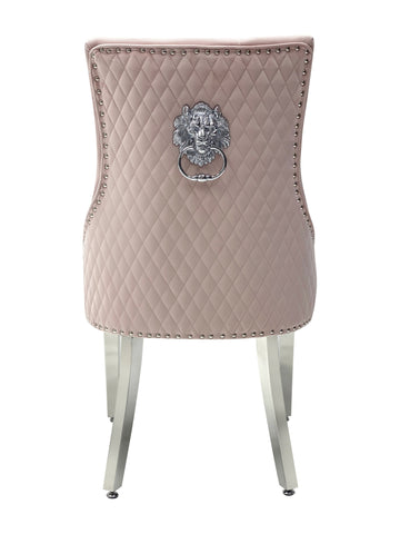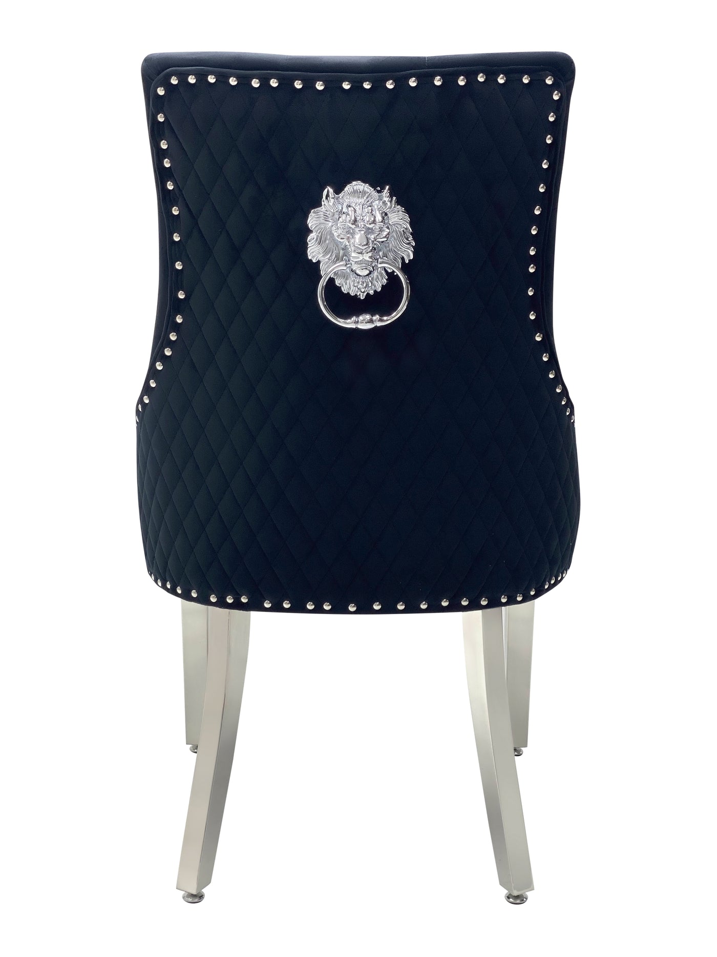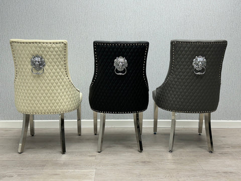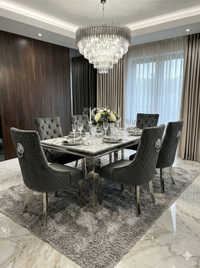 Elevate your dining space with this stunning Sofia Grey Marble table, perfectly paired with elegant lion knocker chairs. This set brings a touch of sophistication and comfort to your meals, making every gathering a grand affair. Its sleek design and plush seating ensure both style and coziness for your dining pleasure.