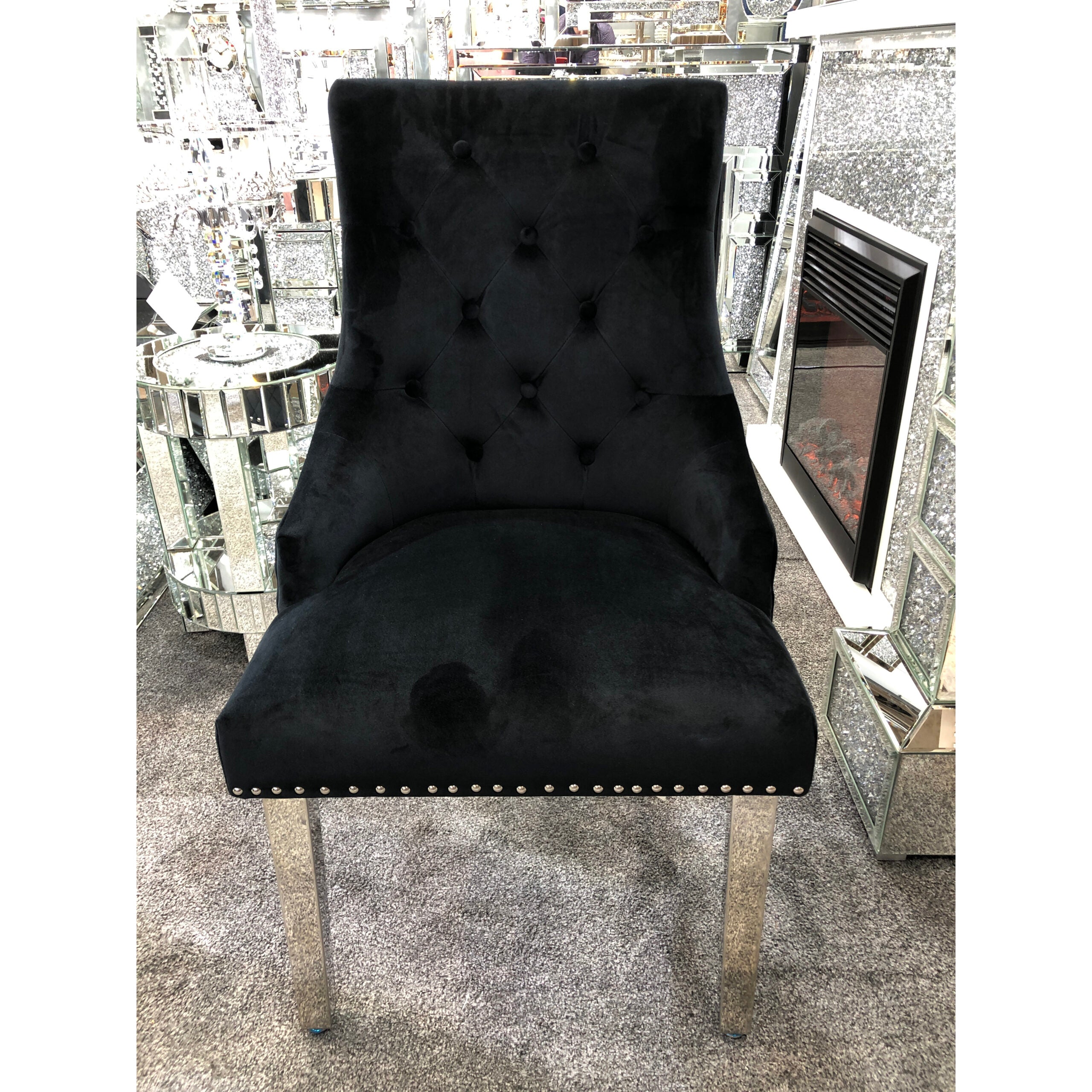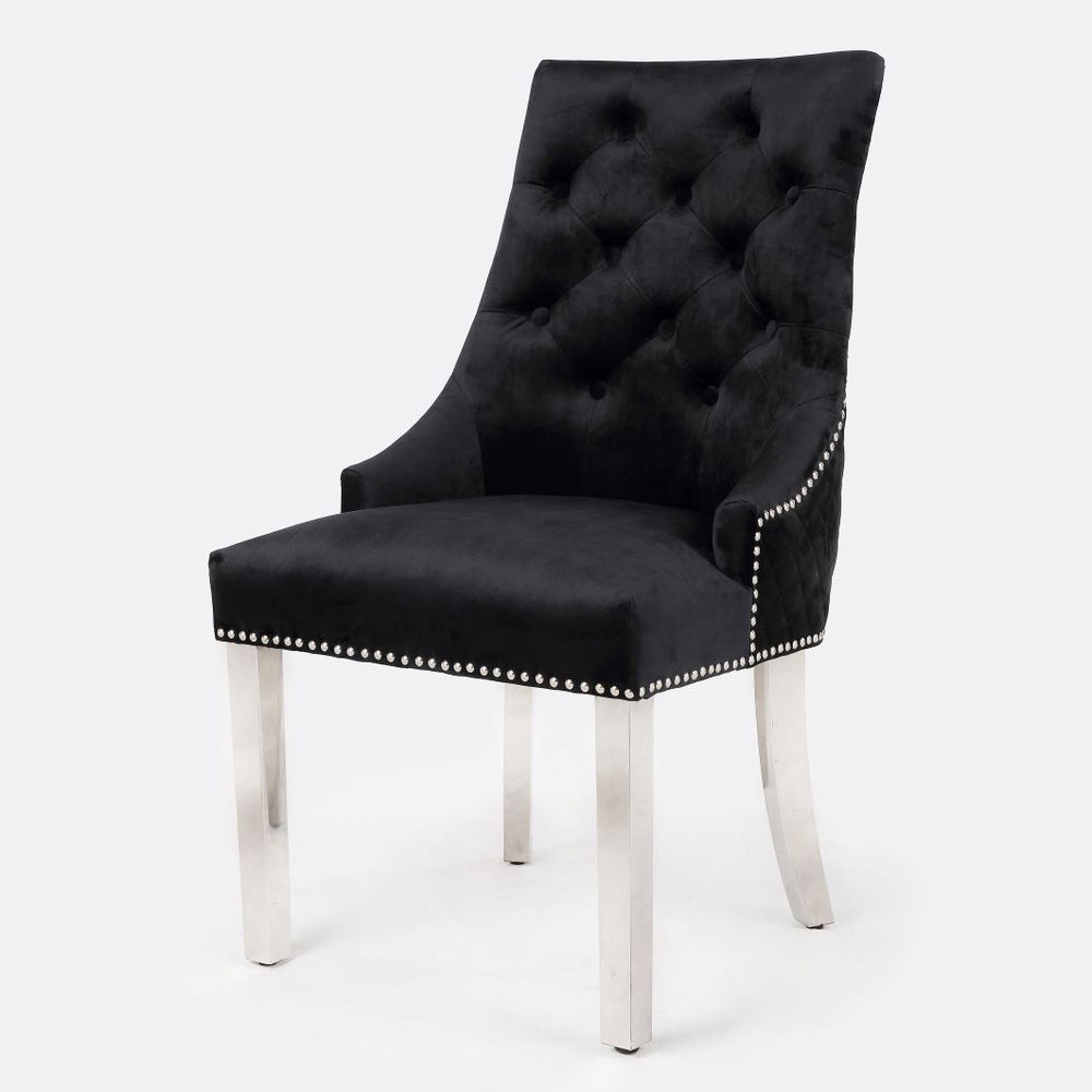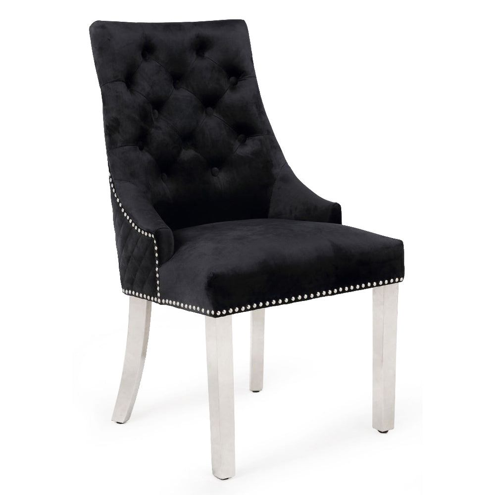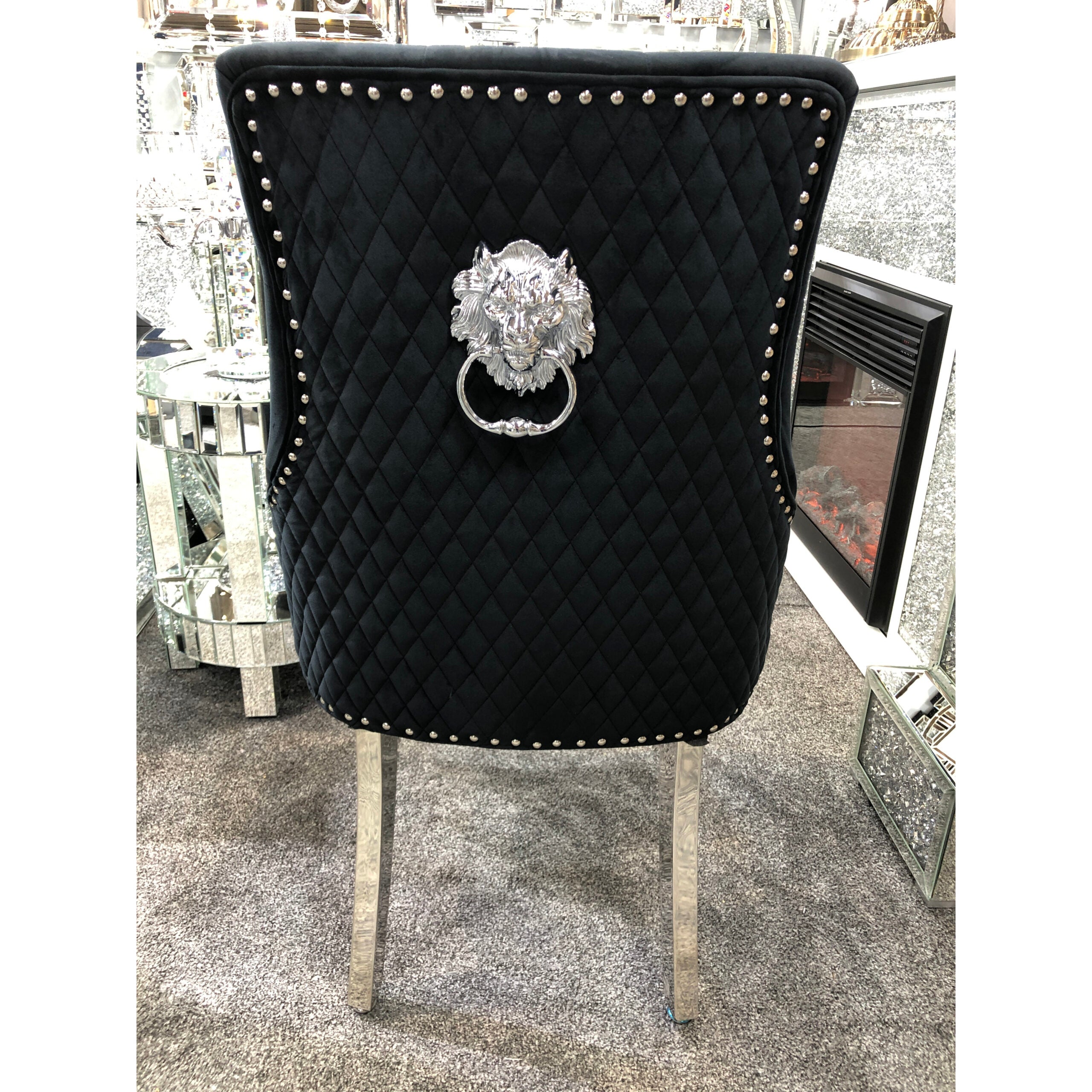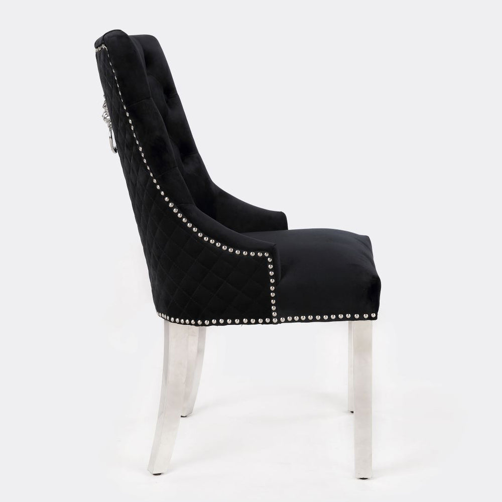 Add a touch of regal elegance to your home with the Majestic Black Velvet Dining Chair. This chair boasts a stunning lion knockerback design and sleek chrome polished steel legs, making a bold statement in any room. Sink into the plush, quilted velvet fabric with studded and button detailing for ultimate comfort. Perfect for dining, living, or bedrooms, these chairs are built to last and provide excellent support.