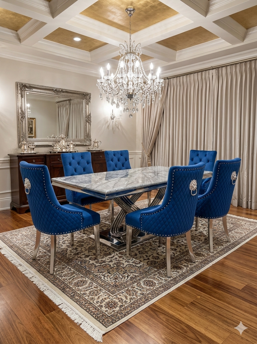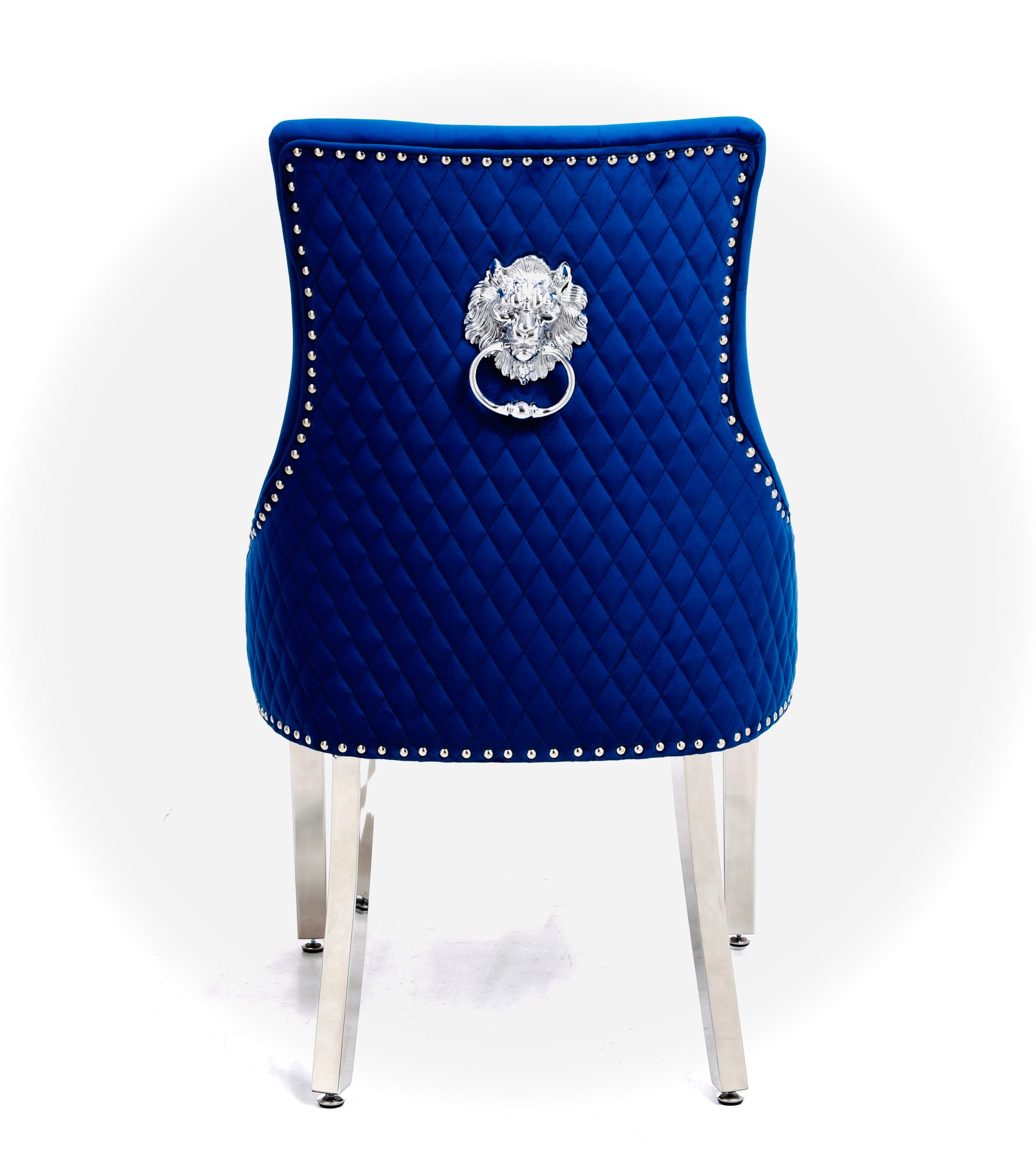 Add a touch of regal charm to your dining space with this stunning chair. Its plush navy velvet and unique lion knockerback design create a truly majestic feel. The polished chrome legs add a contemporary sparkle, while the padded seating ensures comfortable support. This chair effortlessly blends bold style with cozy comfort, making it a perfect addition to any room.