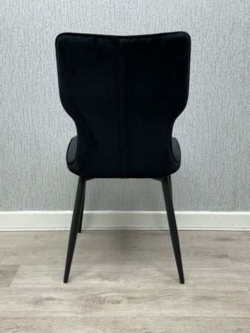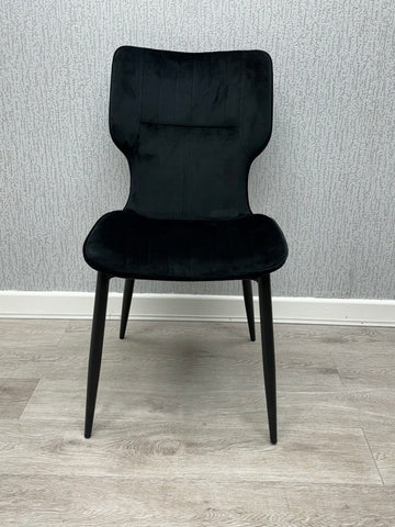 Sink into the sophisticated charm of this Windsor Black Velvet Chair. Upholstered in sumptuous black velvet, it offers a plush seating experience, ideal for adding a touch of elegance to any dining space. The sturdy black metal frame ensures lasting durability and a sleek, contemporary aesthetic. Perfect for long, delightful dinners or a quiet moment with a cuppa.