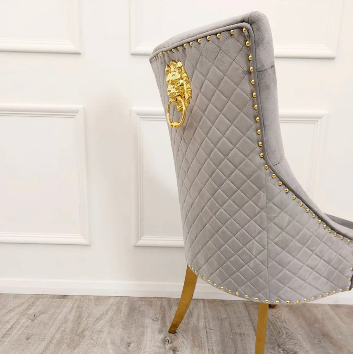 Unleash a touch of opulence in your dining space with the magnificent 2M Monaco Gold Dining Table, a true showstopper for any home. This stunning centrepiece boasts a luxurious marble top, swirling with captivating shades of grey, brown, black, white, and cream. Choose from a delightful array of elegant chairs – Majestic, Valentino, or Victoria styles – each featuring chic Lion or Ring knockers to suit your fancy. Gather your favourite people for unforgettable feasts and sparkling conversations around this truly grand and inviting table.