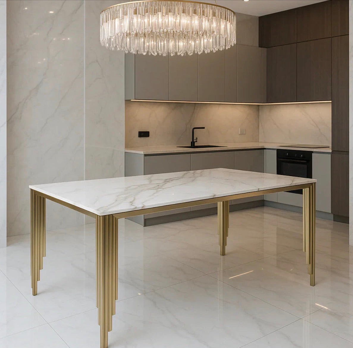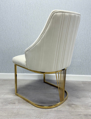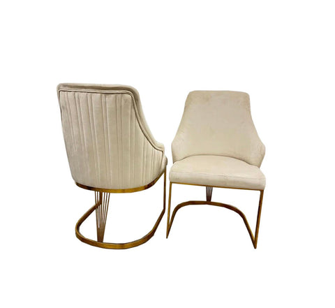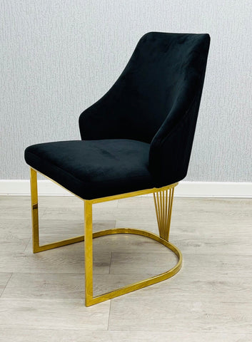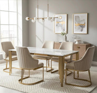 Elevate your dining experience with this rather splendid Mayfair gold dining table set, a true showstopper for any modern home. Its elegant design and durable construction promise to make every meal a special occasion. Pick from luxurious mink, bold black, or vibrant green gold-accented chairs to perfectly complement your interior. Each chair boasts high-quality fabric, gleaming gold metal legs, and supreme ergonomic comfort, ensuring your guests dine in style.
