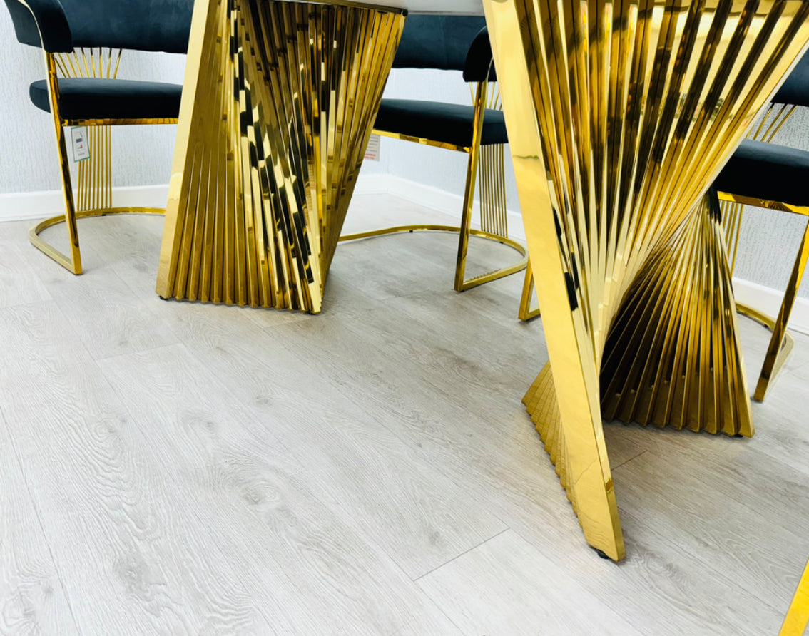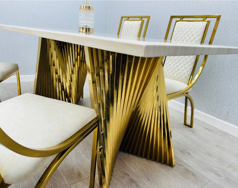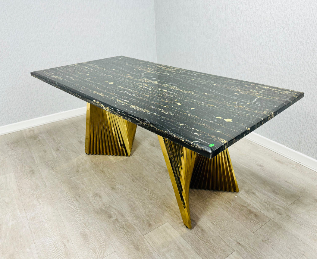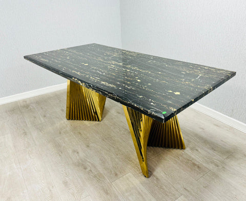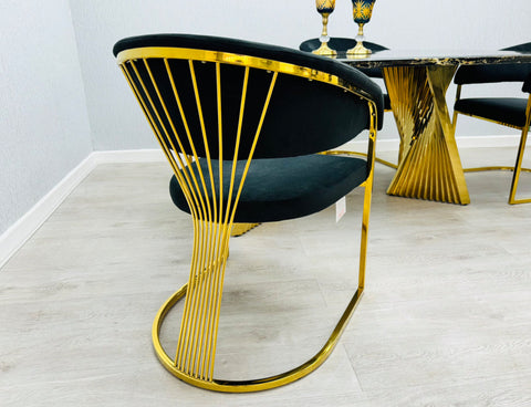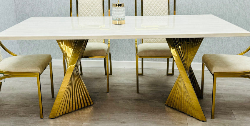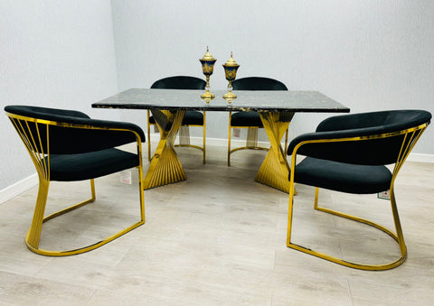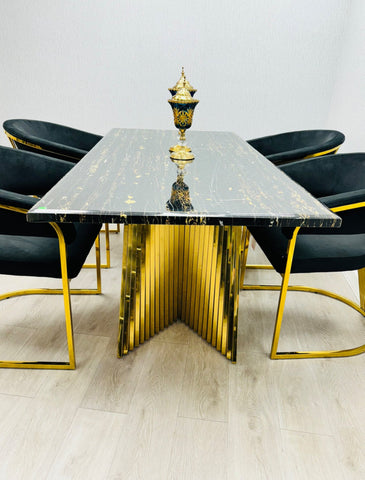 Step into luxury with the Rocco 180cm Black & Gold Marble Dining Table, a true showstopper featuring an opulent black and gold marble top and a dazzling gold metal frame. This magnificent table is perfectly matched with the Porado Dining Chairs, available in sumptuous Cream Leathaire or a sophisticated Black and Gold fabric. Each chair is designed with a chic gold frame, promising both supreme comfort and undeniable style for your dining adventures. This exquisite ensemble transforms any meal into a lavish occasion.