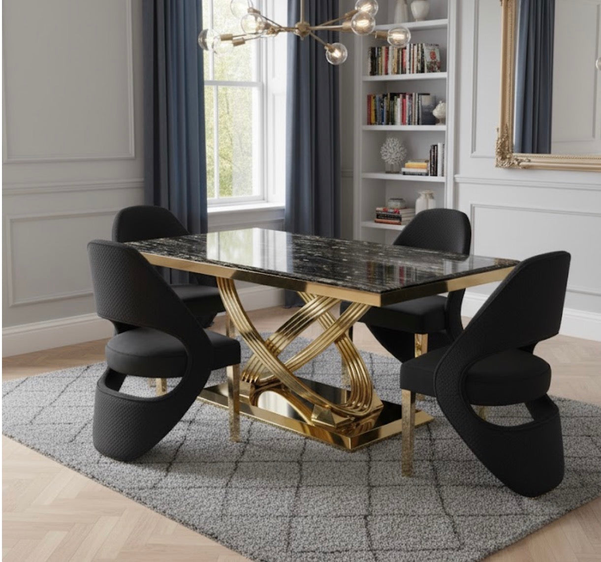 Rose Black and Gold Marble Dining Table + Santorini Black And Gold Dining Chairs Sale