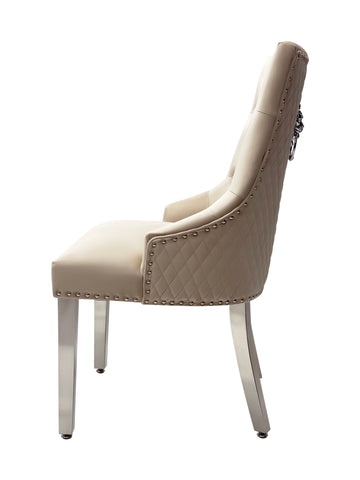 Elevate your dining space with this stunning Sofia Grey Marble table, perfectly paired with elegant lion knocker chairs. This set brings a touch of sophistication and comfort to your meals, making every gathering a grand affair. Its sleek design and plush seating ensure both style and coziness for your dining pleasure.
