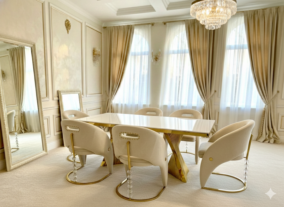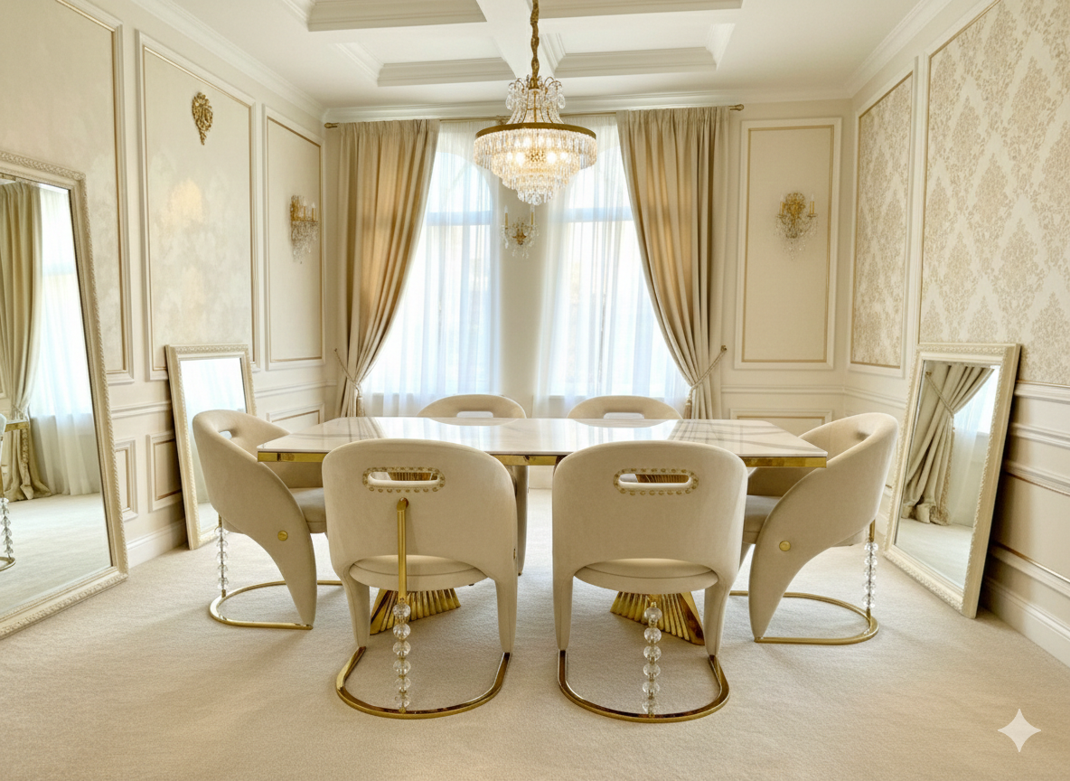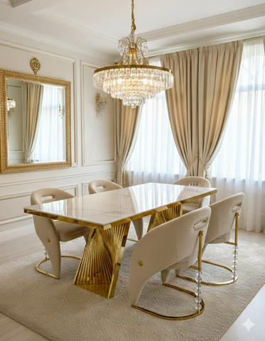 Discover the Elina Cream and Gold Marble Dining Table, a truly dazzling centerpiece for your dining space. Its luxurious cream marble top pairs perfectly with the radiant golden pedestal base, creating an ambiance of pure elegance. Gather your favorite people around this magnificent table for unforgettable meals and sparkling conversations. Crafted for both beauty and durability, it's ready to elevate your home with its sophisticated charm.
