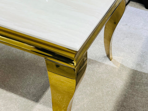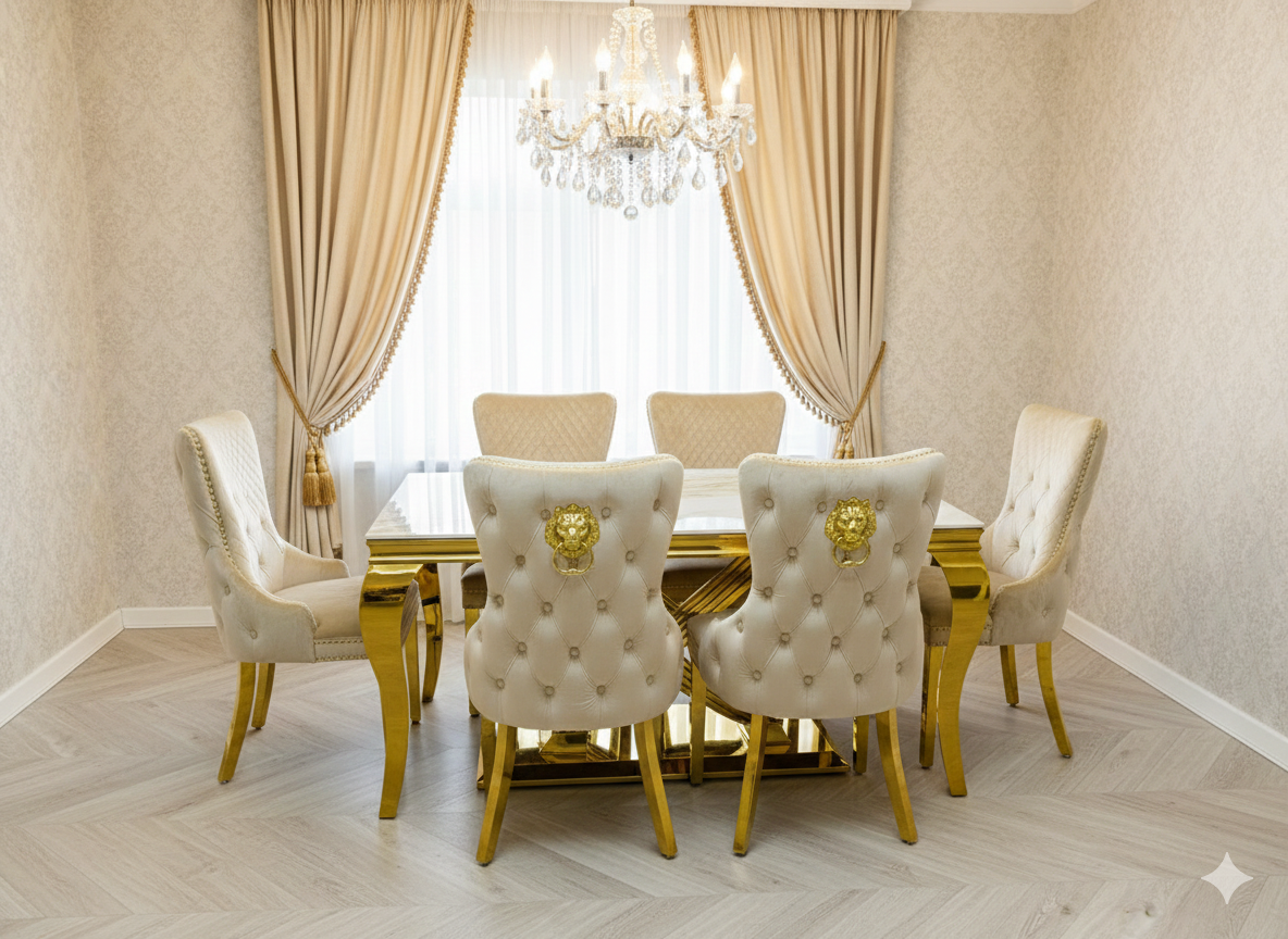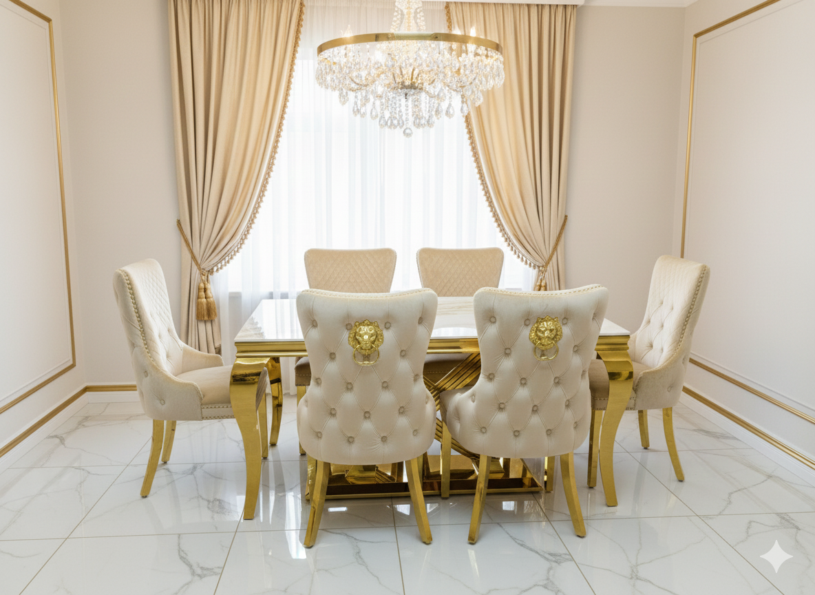 Discover the Elina Cream and Gold Marble Dining Table, a truly dazzling centerpiece for your dining space. Its luxurious cream marble top pairs perfectly with the radiant golden pedestal base, creating an ambiance of pure elegance. Gather your favorite people around this magnificent table for unforgettable meals and sparkling conversations. Crafted for both beauty and durability, it's ready to elevate your home with its sophisticated charm.