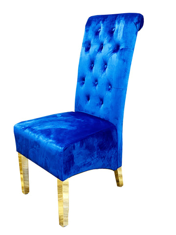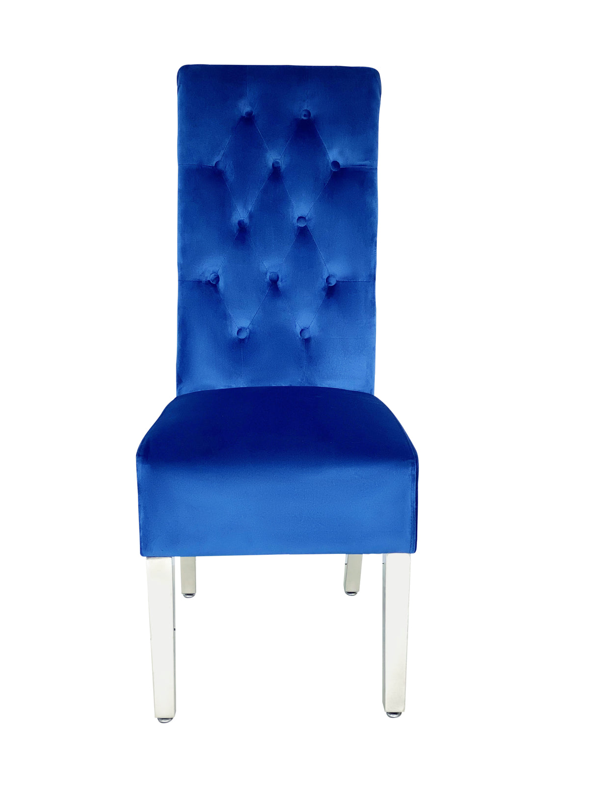 Add a touch of regal charm to your dining space with this stunning navy velvet chair. Its plush upholstery and chrome lion knocker back are sure to make a statement, while the chrome legs provide sturdy support and modern flair. This chair is the perfect blend of comfort and majestic style for your dining room. Elevate your meals and conversations with this elegant seating.