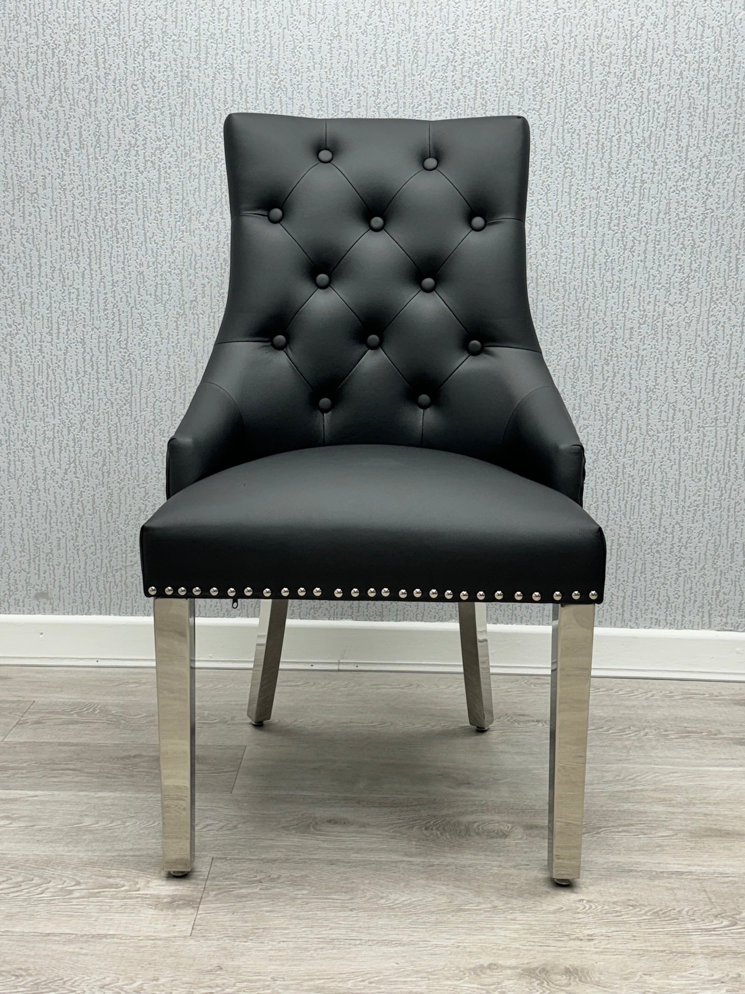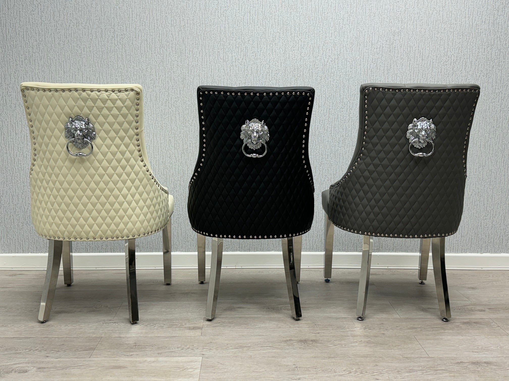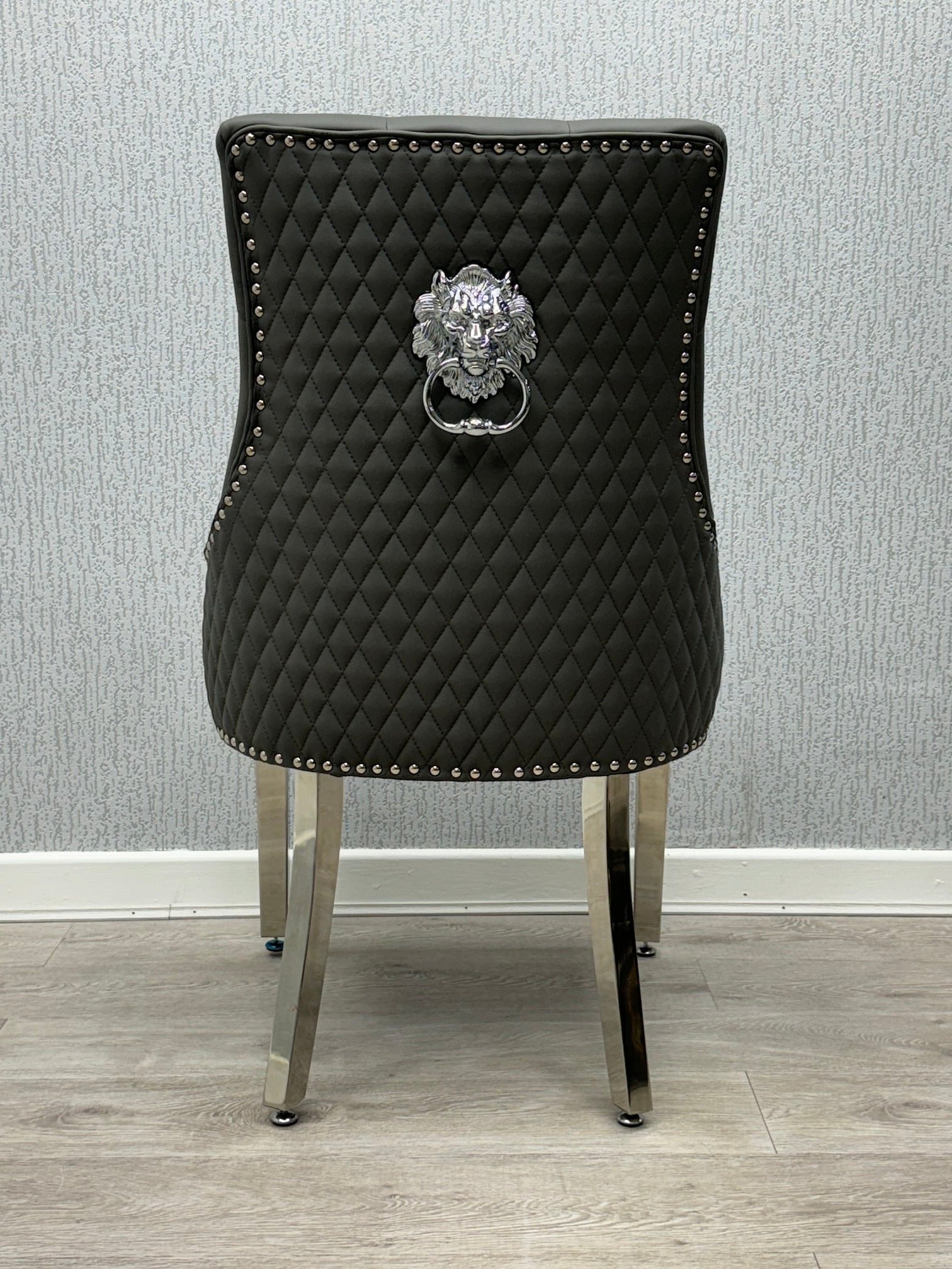 Add a majestic touch to your dining space with this stunning black PU dining chair. Featuring a unique lion knockerback design and sleek chrome polished steel legs, it's sure to impress. The chair boasts padded seating with a comfortable curved backrest, wrapped in luxurious quilted PU for ultimate comfort and style. This versatile piece is perfect for dining, living, or even bedroom use, offering both elegance and sturdy support.