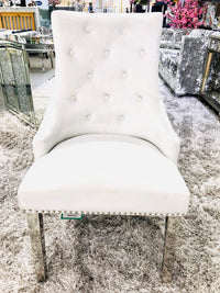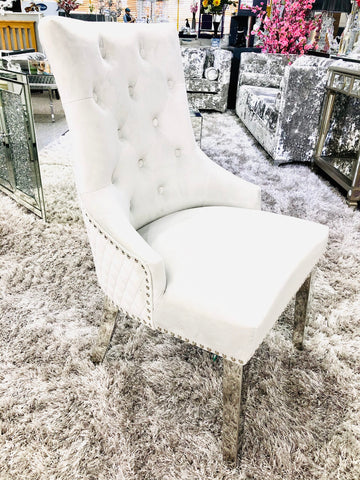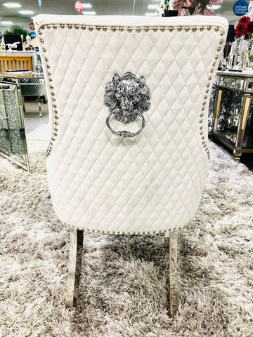 Add a touch of grandeur to your home with the Majestic Silver Dining Chair. This stunning piece boasts a plush, quilted velvet fabric, complemented by a distinctive lion knockerback design. Its polished chrome steel legs and studded detailing create a luxurious look that's perfect for dining, living, or bedroom spaces. These chairs are well-padded for comfort and built to last, ensuring a regal feel in any setting.