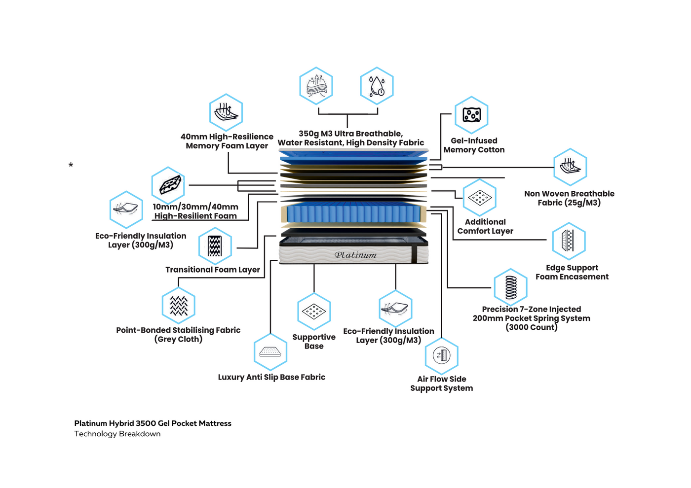 Drift into a dreamland of luxury with the Platinum Mattress, your ticket to unparalleled comfort every night. This mattress boasts an advanced 3500 pocket gel system and gel-infused memory foam, delivering exceptional support and blissful pressure relief. Its impressive 13.5-inch depth ensures a truly plush experience, while clever temperature regulation keeps you cool and cosy. Crafted with premium, durable materials, the Platinum Mattress promises a refreshing and rejuvenating slumber, making every morning a bright one.