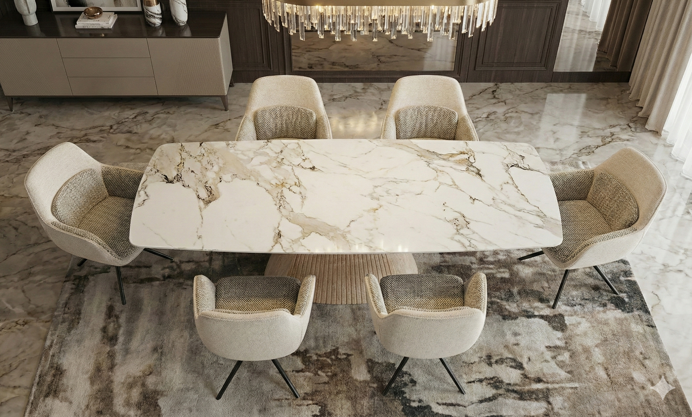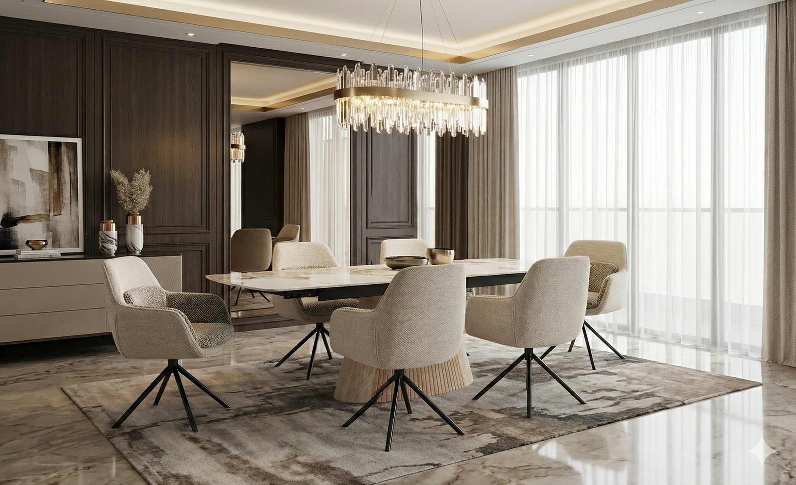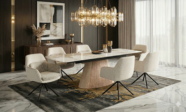 Complete your dining ensemble with the Mona Extendable Dining Table paired with Florence 360 swivel chairs, a curated collection designed for contemporary living. The table expands from 160cm to 240cm, accommodating up to ten diners with ease. Its Beige Sintered Stone surface delivers an authentic marble aesthetic whilst providing exceptional durability against scratches, stains, and heat exposure. The sculptural pedestal base anchors the design with architectural presence, complemented by softly rounded corners that enhance visual flow. The Florence swivel chairs offer ergonomic comfort and 360-degree mobility, allowing seamless interaction throughout your dining space. Together, these pieces exemplify refined craftsmanship and functional sophistication.