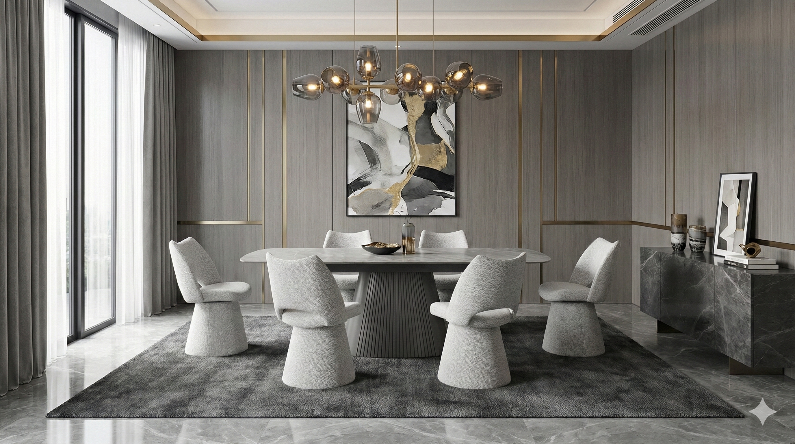 Complete your dining ensemble with the Mona Extendable Dining Table paired with Maryland 360 swivel chairs, a curated collection designed for contemporary living. The table expands from 160cm to 240cm, accommodating up to ten diners with ease. Its Grey Sintered Stone surface delivers an authentic marble aesthetic whilst providing exceptional durability against scratches, stains, and heat exposure. The sculptural pedestal base anchors the design with architectural presence, complemented by softly rounded corners that enhance visual flow. The Florence swivel chairs offer ergonomic comfort and 360-degree mobility, allowing seamless interaction throughout your dining space. Together, these pieces exemplify refined craftsmanship and functional sophistication.