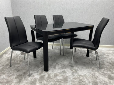 Gather 'round this fabulous Morano Dining Set, complete with four comfy maxi chairs, perfect for adding a touch of class to your dining space. Its chic black finish easily complements any decor, making every meal a stylish affair. This set is designed for durability and daily use, ensuring long-lasting enjoyment for your family and guests. Get ready to create delightful memories around this charming and practical dining solution.