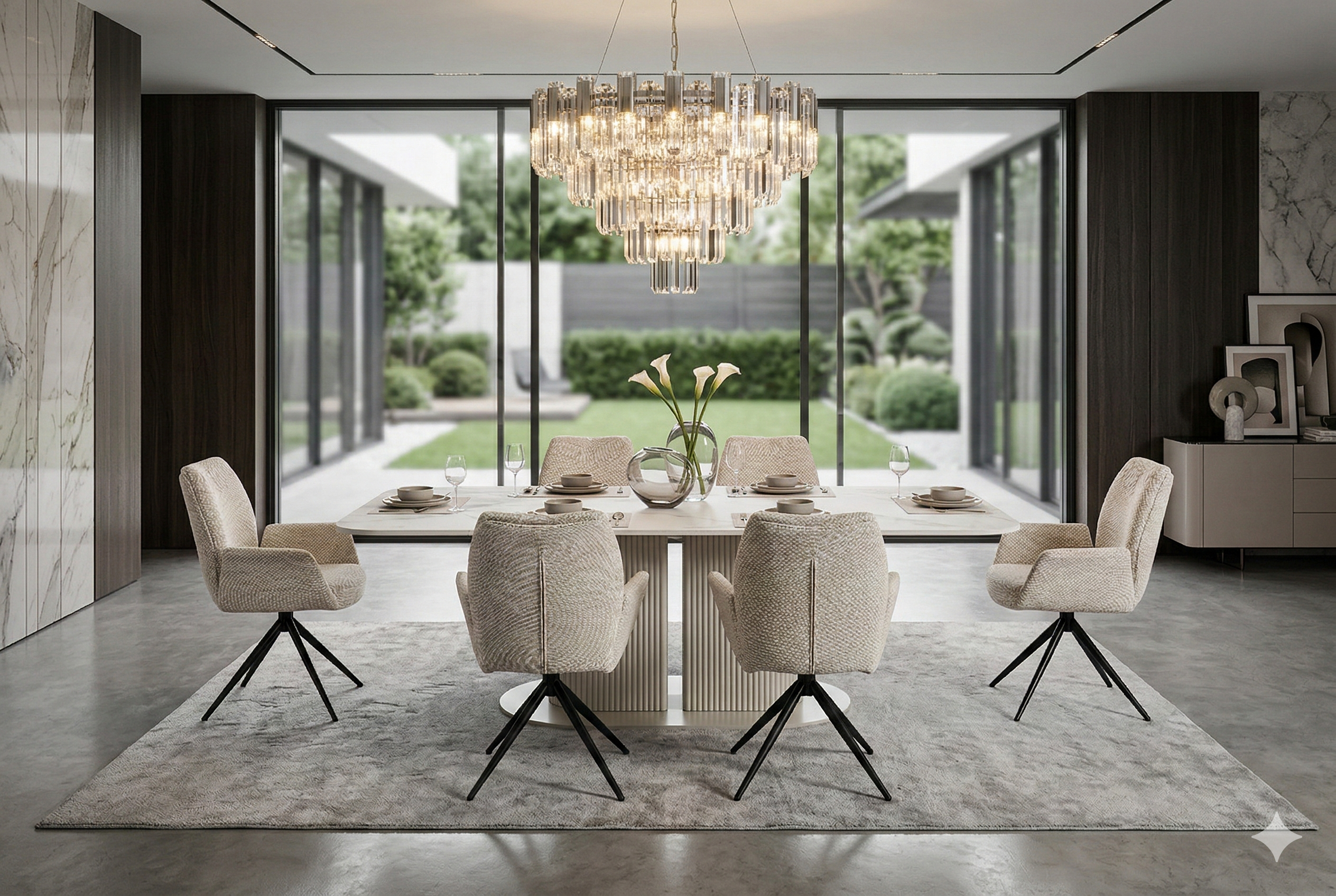 Sydney range, a collection that embodies contemporary elegance through its sleek designs and soft curved edges. Each piece in this range features a ceramic sintered stone tabletop and a distinctive ribbed base.