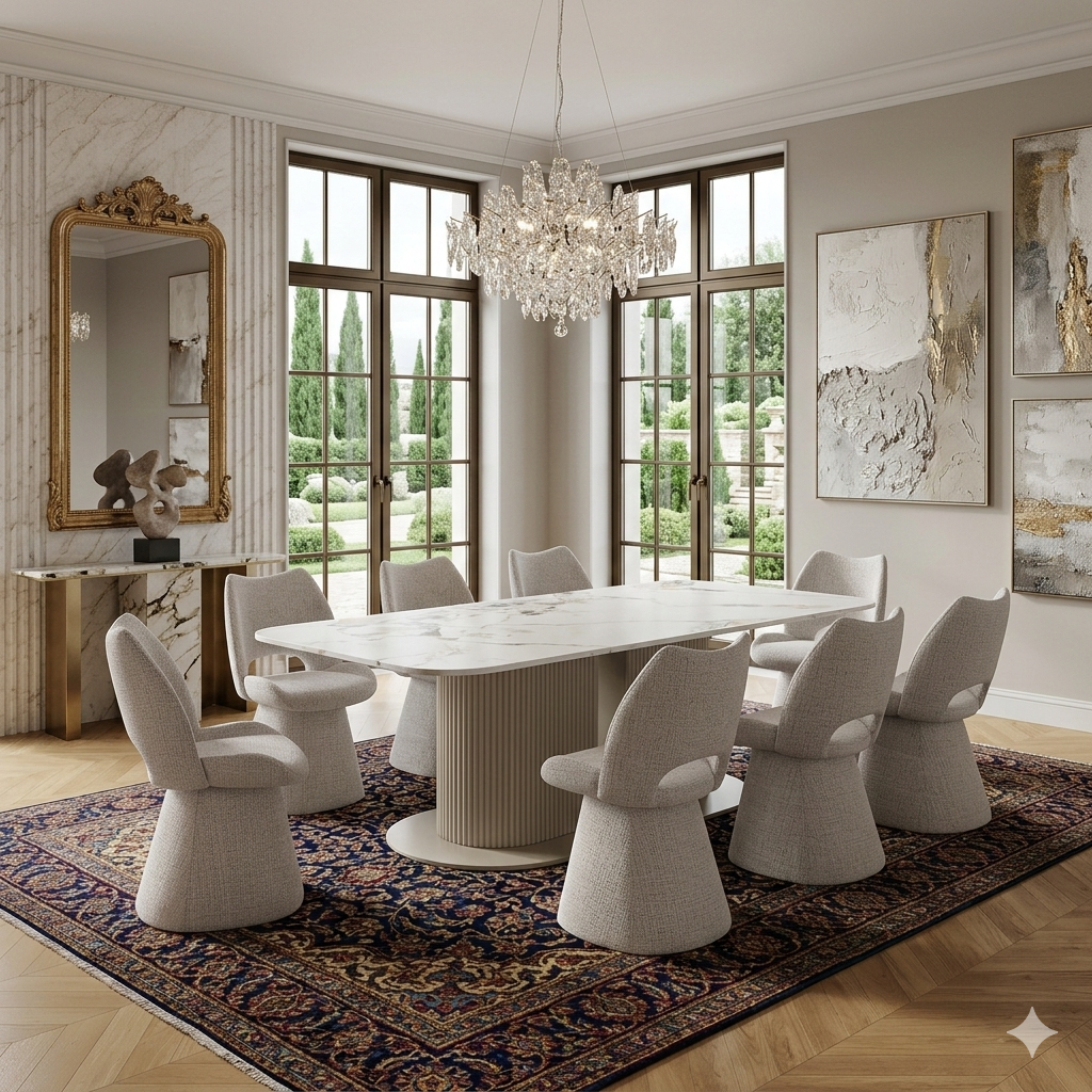 Sydney range, a collection that embodies contemporary elegance through its sleek designs and soft curved edges. Each piece in this range features a ceramic sintered stone tabletop and a distinctive ribbed base.