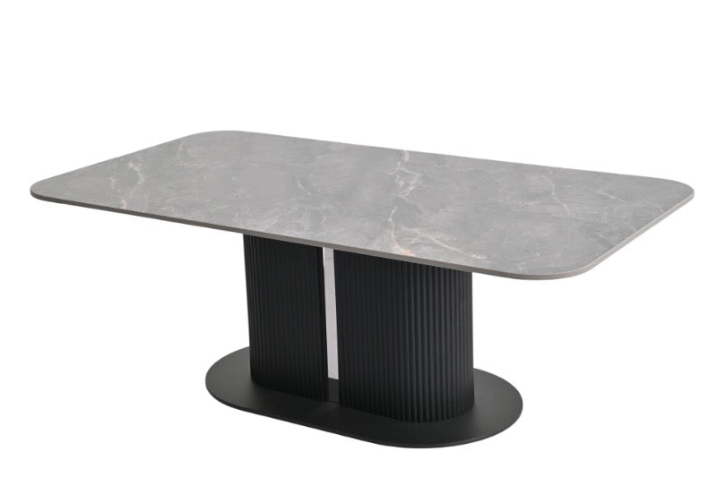Sydney range, a collection that embodies contemporary elegance through its sleek designs and soft curved edges. Each piece in this range features a ceramic sintered stone tabletop and a distinctive ribbed base.