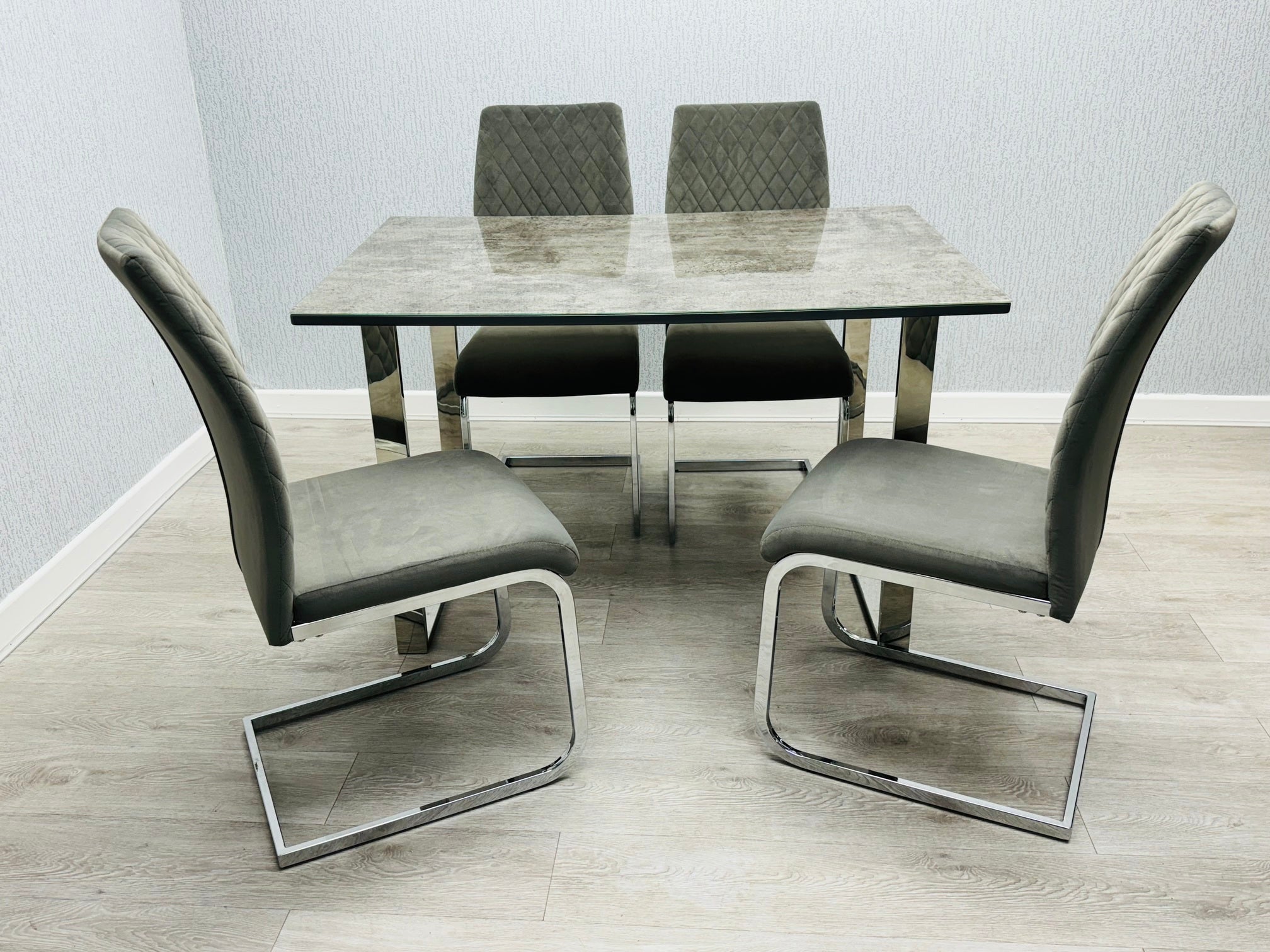 Tokyo Grey Stone Effect Glass Table with 4 Grey Plush Chairs