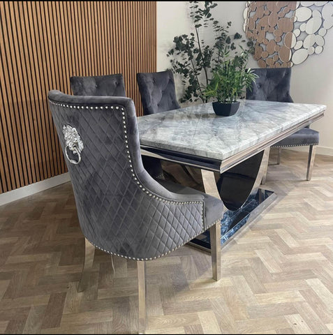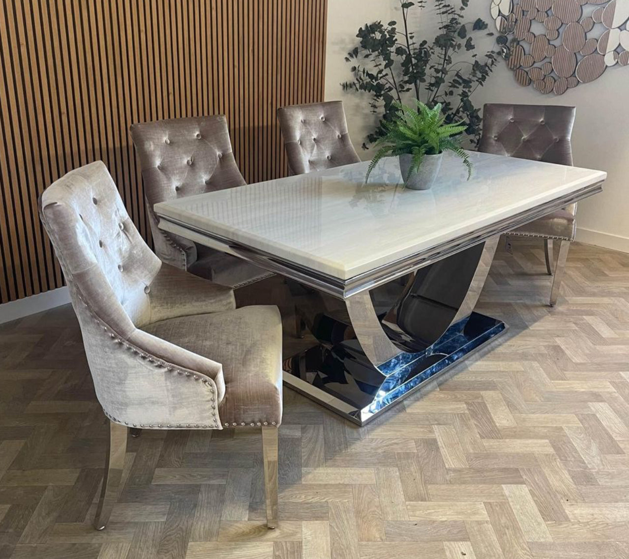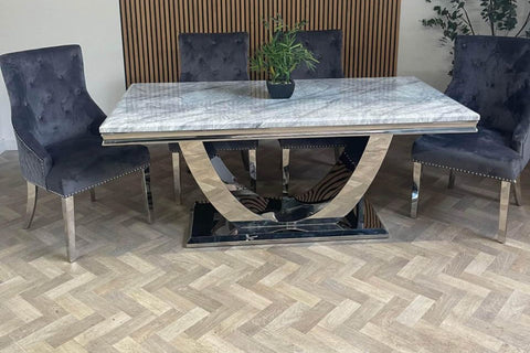 Transform your dining room with this show-stopping centrepiece that combines bold modern aesthetics with practical performance. The elegant tabletop—available in either opulent marble or sleek tempered glass—rests on a polished stainless steel pedestal base, offering a stunning swooping design that demands attention.