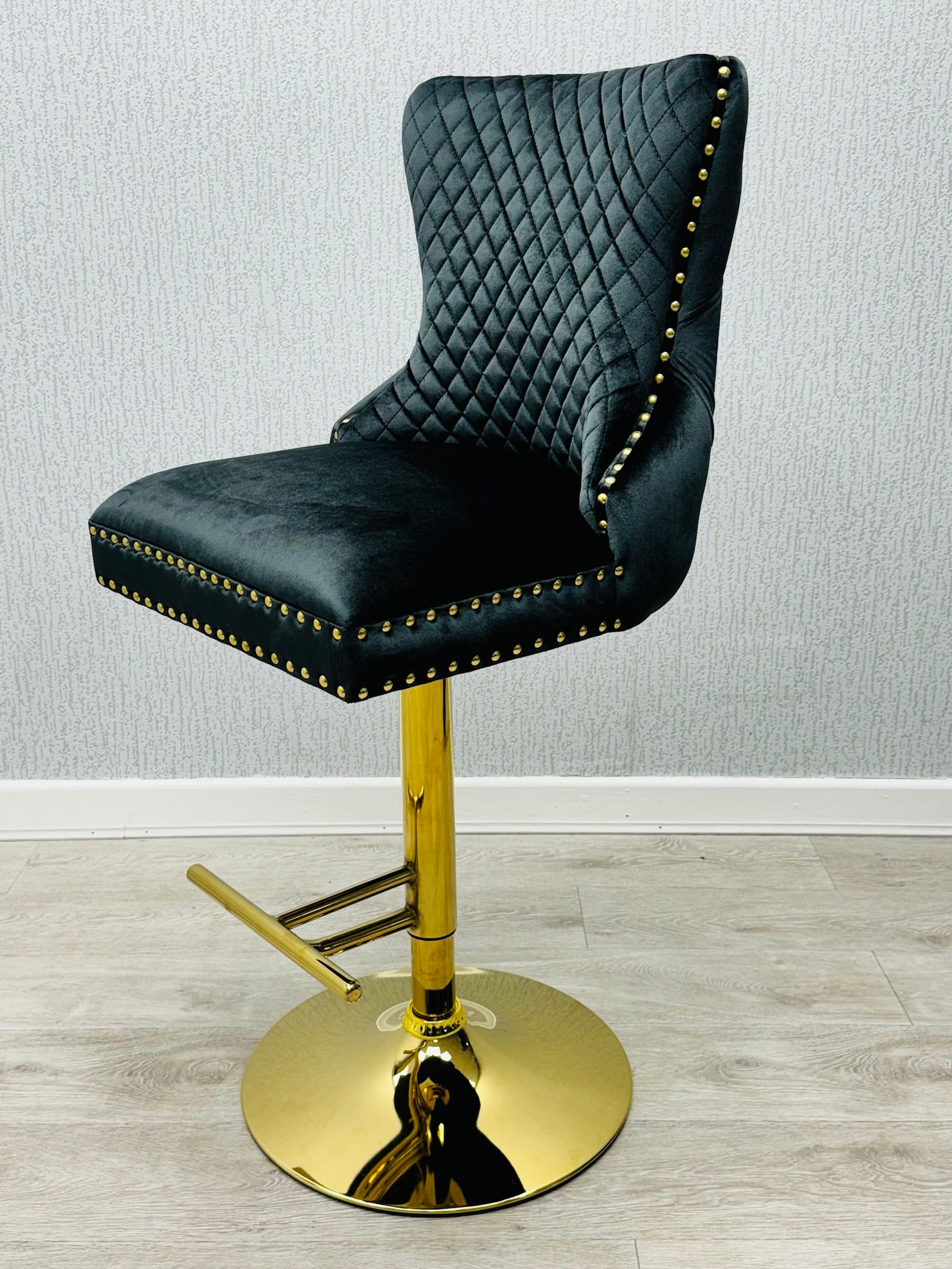 Elevate your kitchen or bar area with this stunning bar stool, featuring a luxurious black velvet finish and eye-catching gold accents. The distinctive lion knocker adds a touch of regal charm, making it a true statement piece. Enjoy comfortable seating and a dash of glamour, perfect for entertaining guests or enjoying a quiet meal. This stool seamlessly blends sophisticated design with practical everyday use.